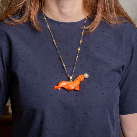 Handmade Coral Sculpture Pendant with Diamonds and Pearl – 18ct Gold, Vintage 1960s–1970s