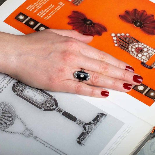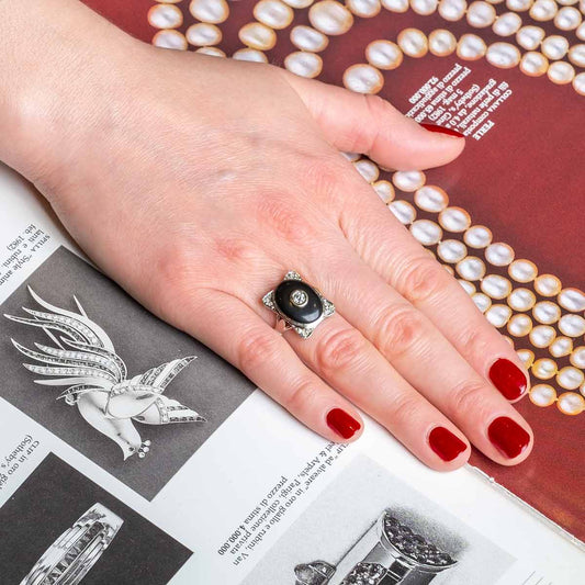 Deco inspired onyx and diamond cocktail ring