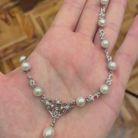 1940s Vintage 18ct White Gold Necklace with Japanese Cultured Pearls and Diamond