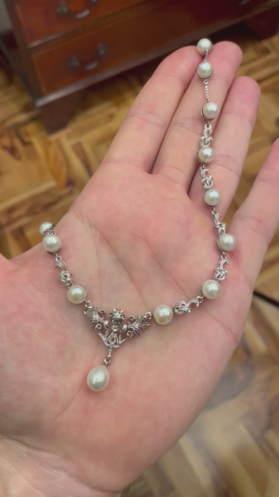 Refined 1940s vintage necklace crafted in 18ct white gold, finely detailed and adorned with Japanese cultured pearls measuring approx. 7 mm. At the center, a small 0.05 ct diamond adds a delicate sparkle and elegance. A unique period jewel, showcasing the artisanal mastery of the era, perfect for special occasions or vintage jewellery collections.