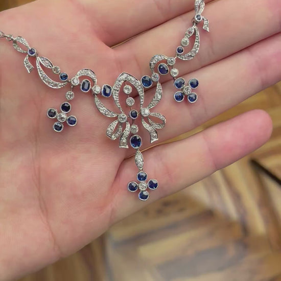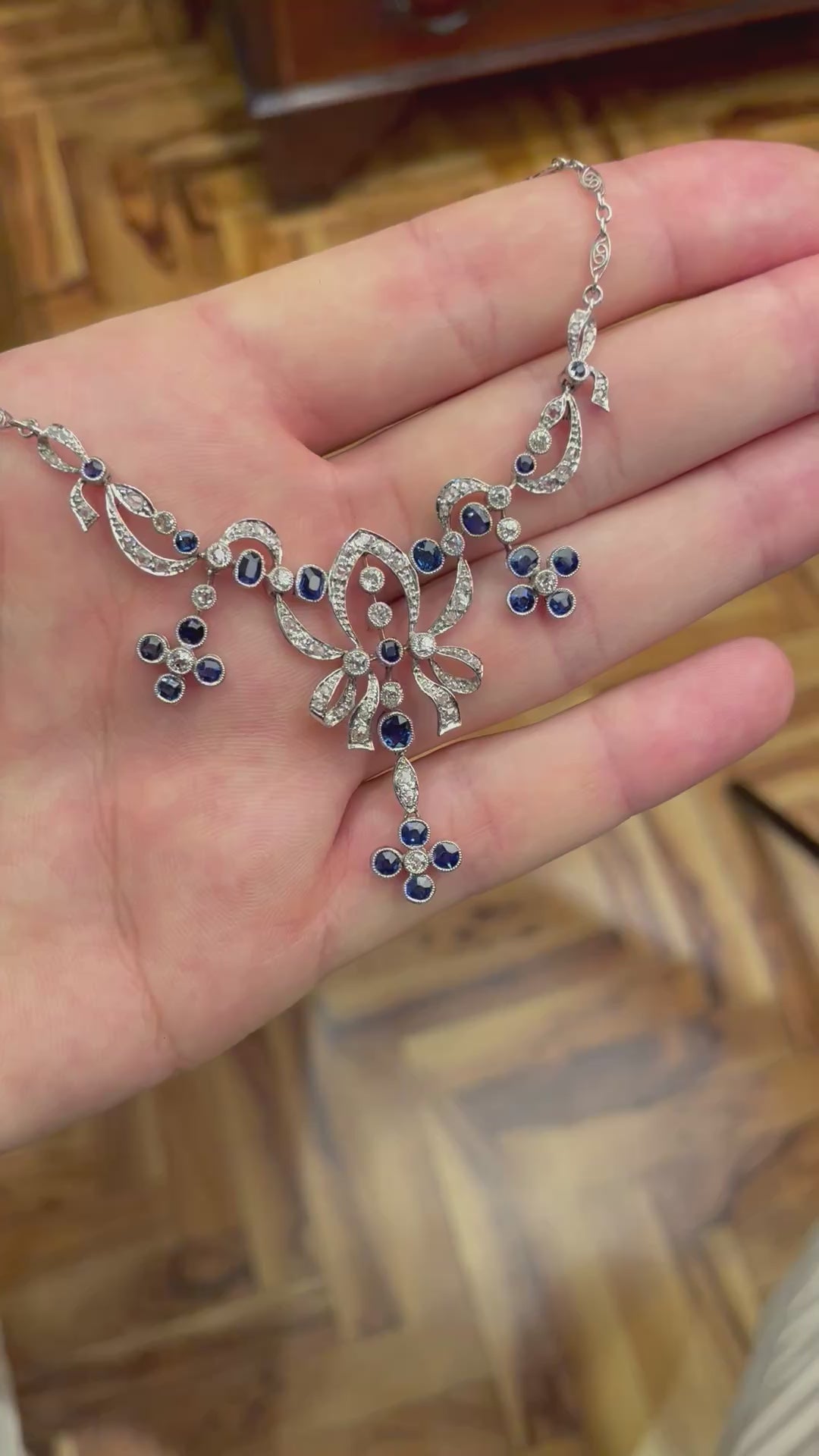 - Stones: Old-cut diamonds (~1.7 ct) and natural sapphires (~2 ct)