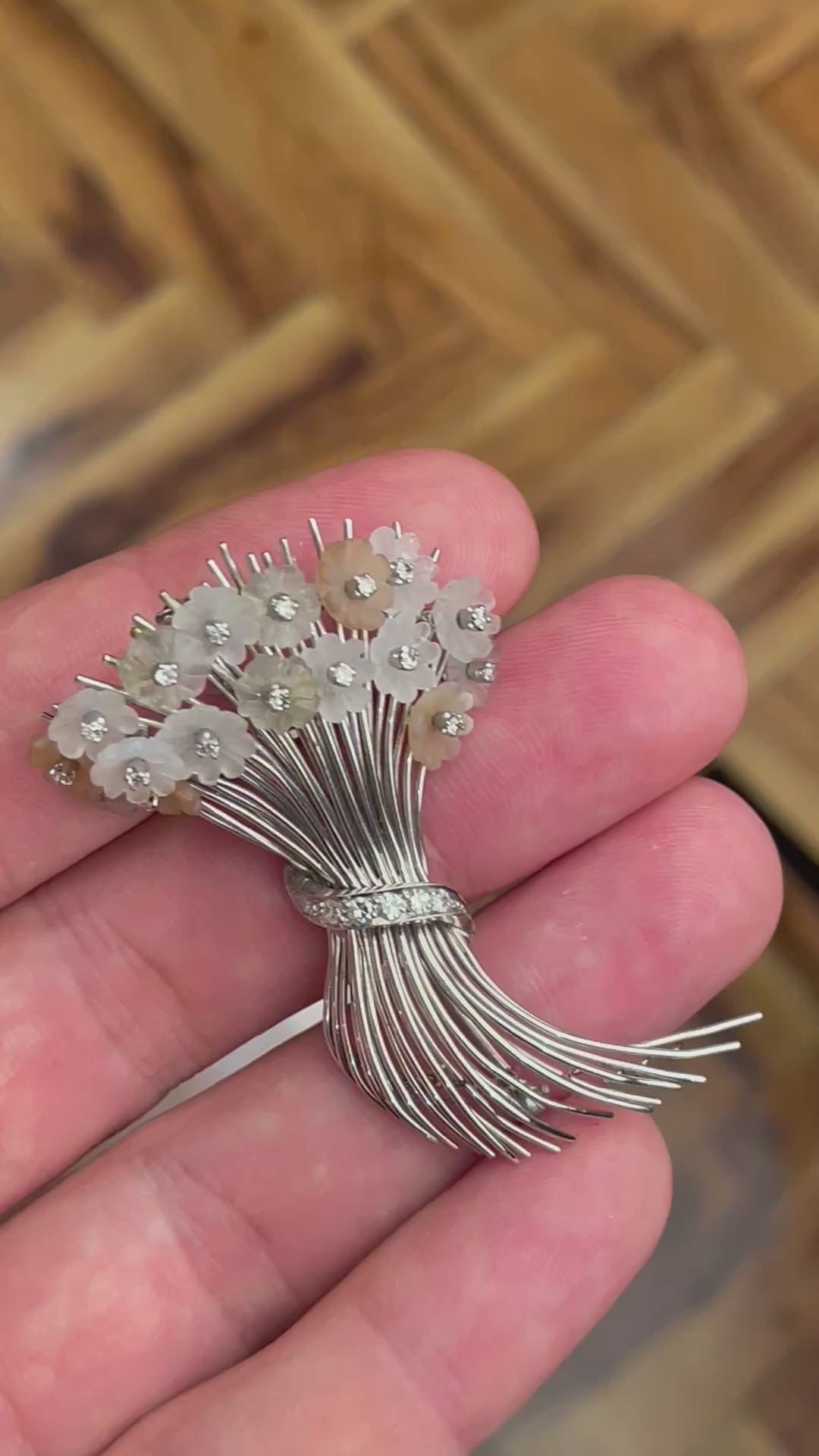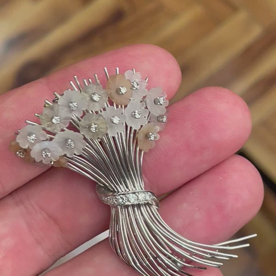 Elegant 1960s brooch, crafted in 18ct white gold and featuring a delicate hand-carved chalcedony depicting a charming bouquet of flowers. Accented with small diamonds totaling approx. 0.34 ct, this piece combines artistry and refinement, making it ideal for those who appreciate vintage jewelry with graceful floral details.