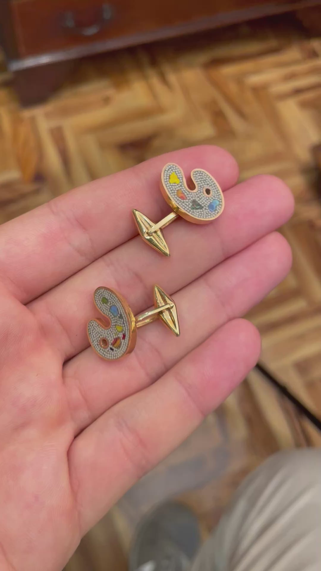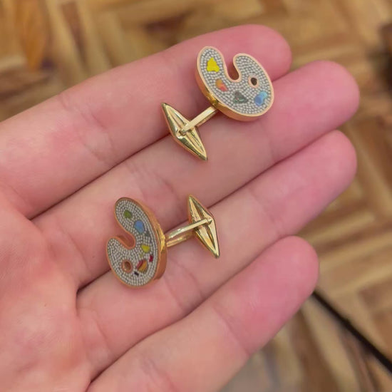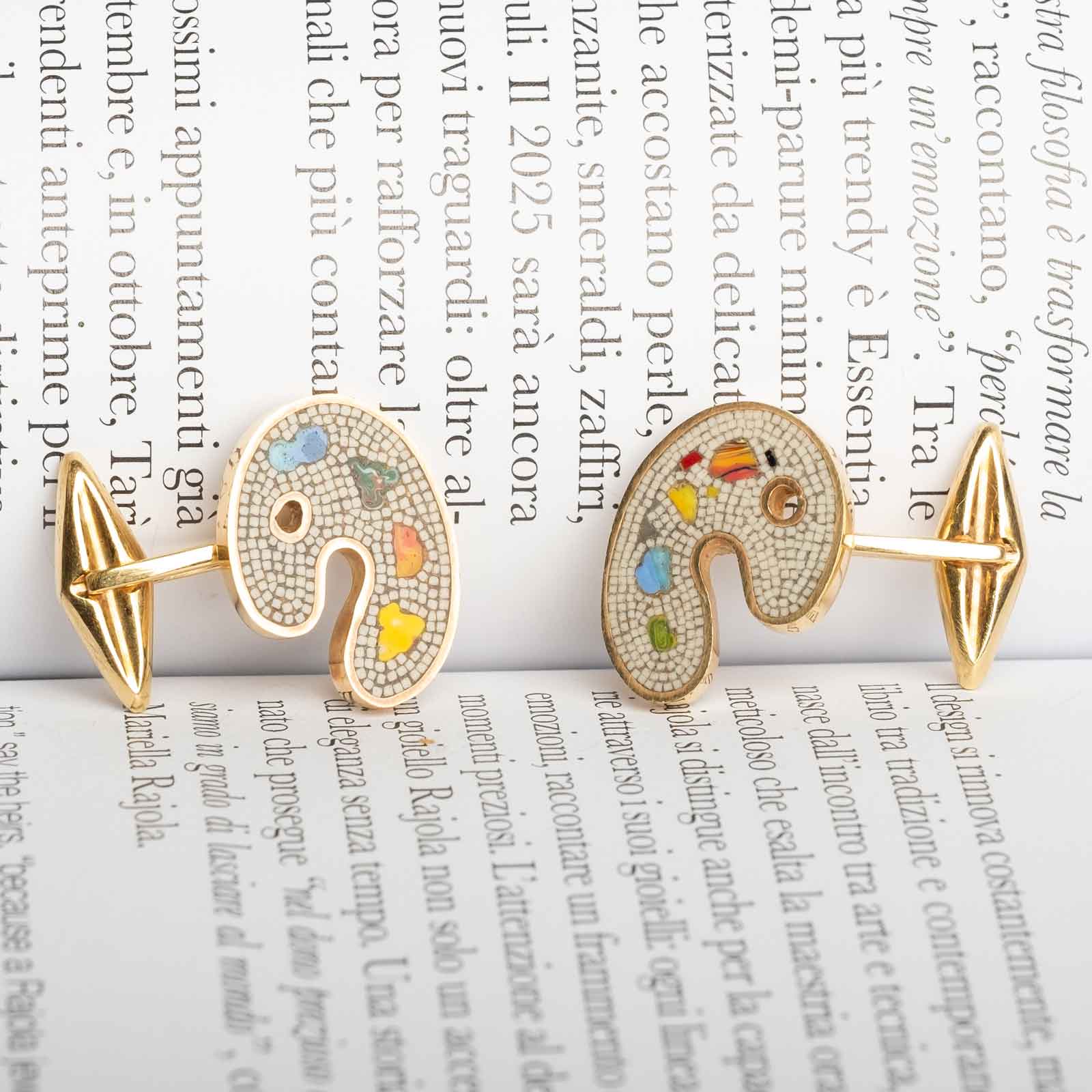 Elegant vintage rigid cufflinks from the 1970s, crafted in 18ct gold and adorned with a fine hardstone micromosaic in the shape of a painter’s palette. A refined artisanal work, signed L. Faraoni, renowned for the quality and originality of his creations.