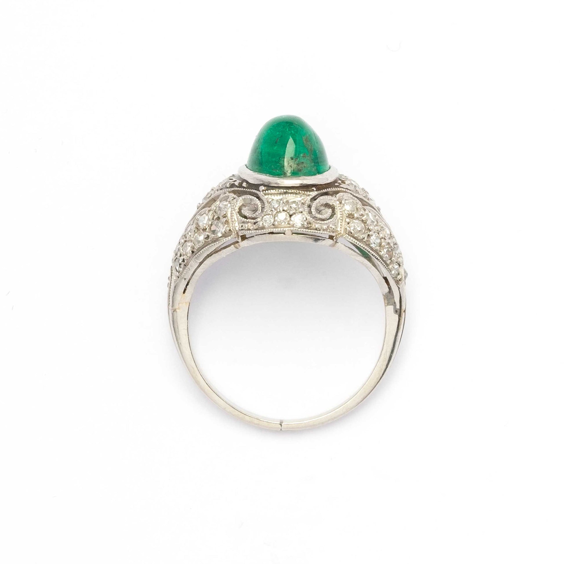 A stunning original ring from the early 1900s, crafted in platinum with a refined domed design, typical of the Liberty / Art Déco style. At its center shines a natural cabochon-cut emerald of approximately 1.5 carats, boasting an intense and vibrant color. Surrounding it is a halo of old-cut diamonds, totaling around 0.56 ct, adding brilliance and timeless charm.