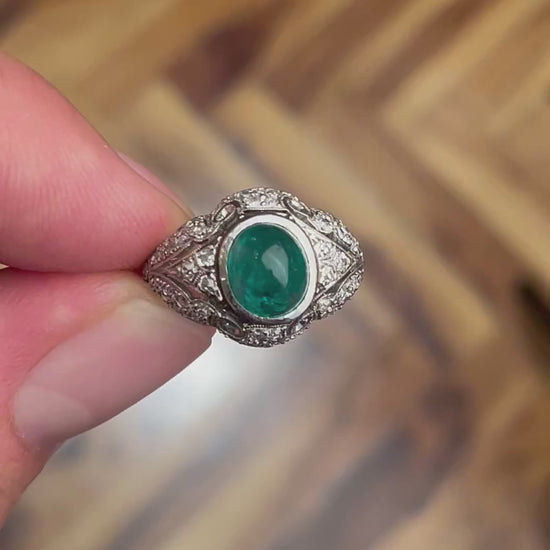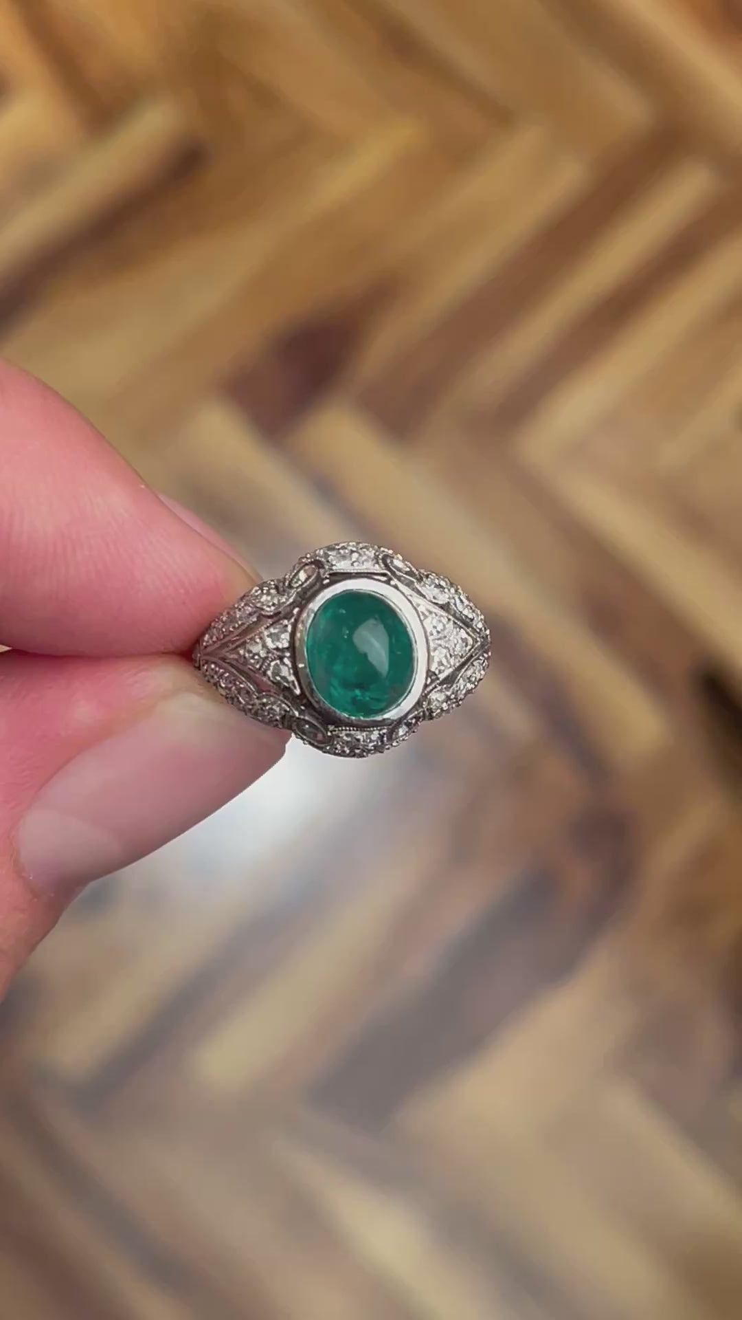 Antique Platinum Ring with Natural Cabochon Emerald and Diamonds – Liberty / Art Déco Style