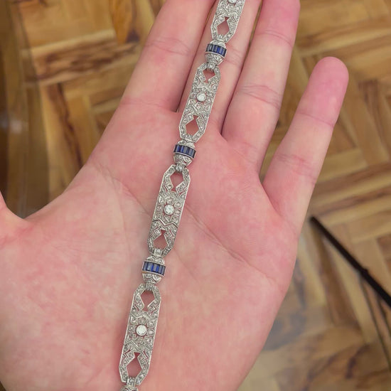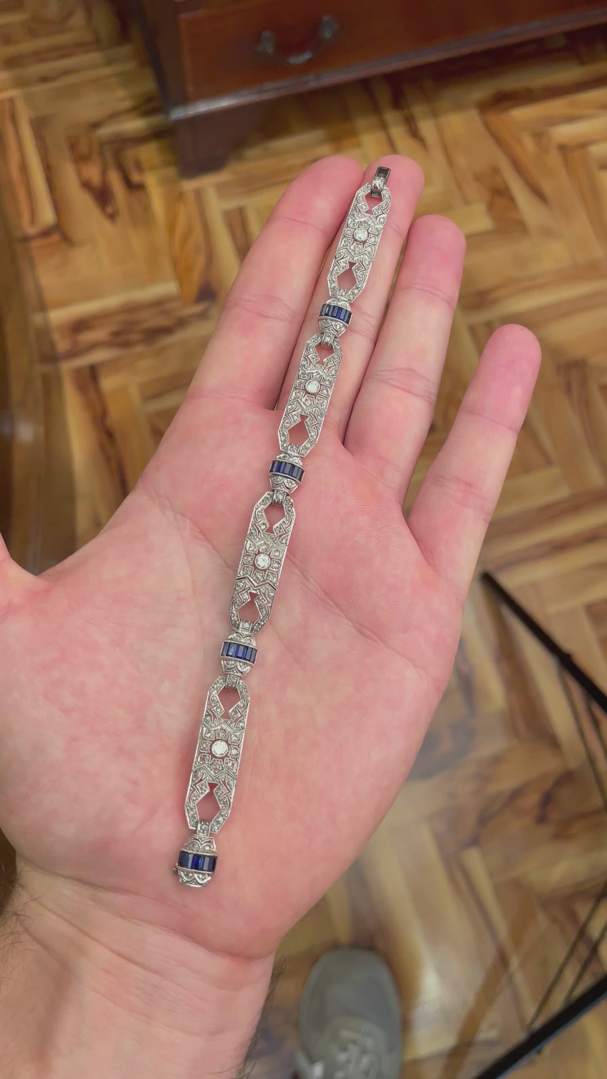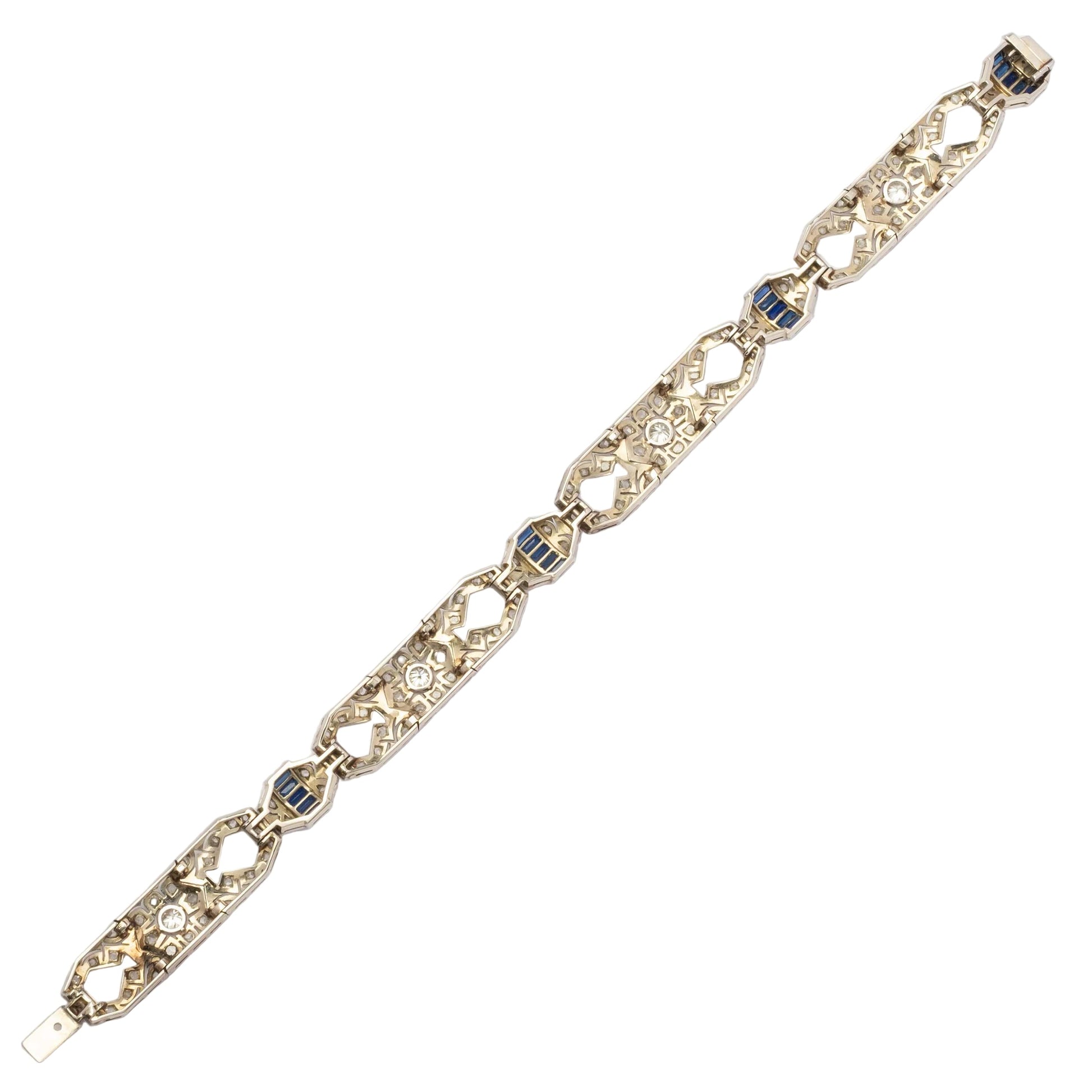 Refined Art Deco bracelet, finely crafted and hand-pierced in 18ct white gold. Its elegant geometric design is enhanced by rose cut and old-cut diamonds, while the central lozenges are accented with emerald-cut blue stones, alternating with the diamonds to create a delicate interplay of light and color.