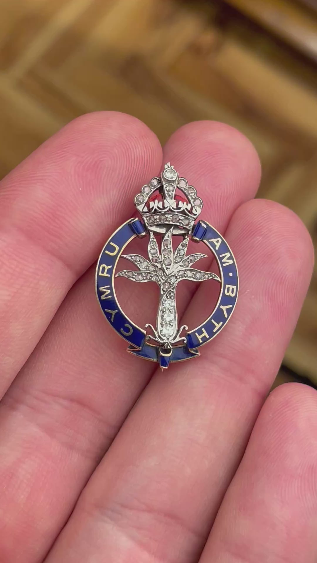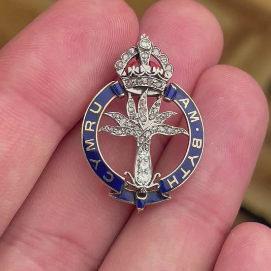 Elegant British regimental brooch of the Welsh Guards, dating back to the early 1900s, crafted in gold and platinum and finely decorated with blue enamel and diamond rosettes. A historic and refined military jewel, ideal for collectors and enthusiasts of British heritage and antique regalia.