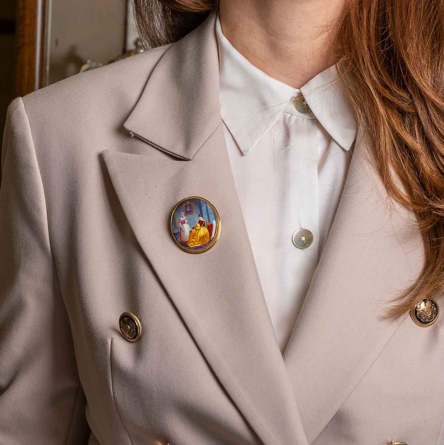 Brooch and pendant set in 18ct gold with miniature hand made painting on enamel, on the back with inscription in French "Tu Aimes" indicating probable French provenance of the piece. End of the 19th Century period c.a.