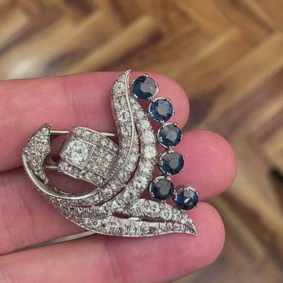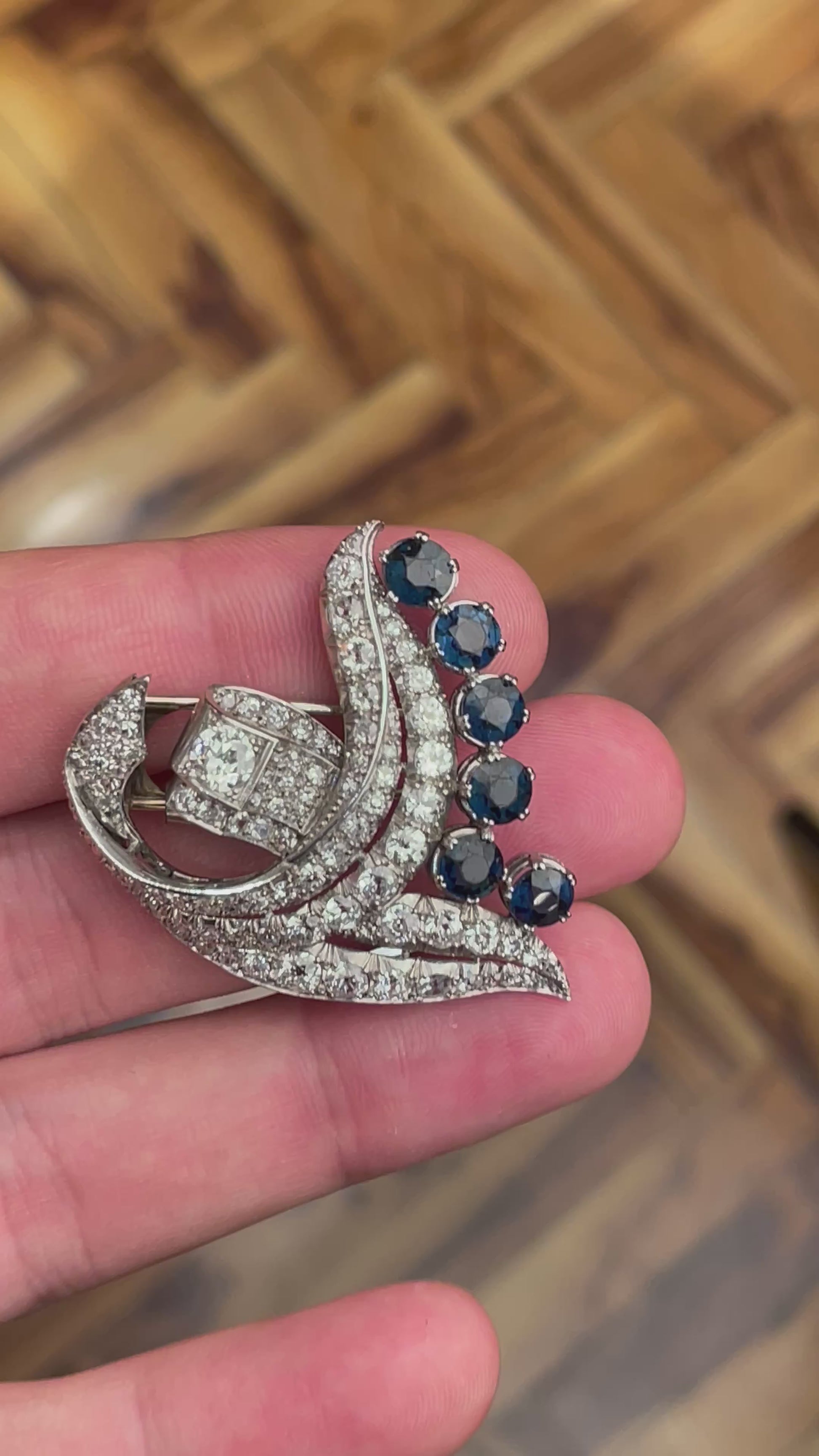 Charming 1940s brooch, finely crafted in platinum with an elegant and refined design. Set with approximately 4 ct of sparkling old-cut diamonds, beautifully accented by blue stones that bring contrast and sophistication. An important and timeless jewel, perfect for lovers of fine vintage jewelry.