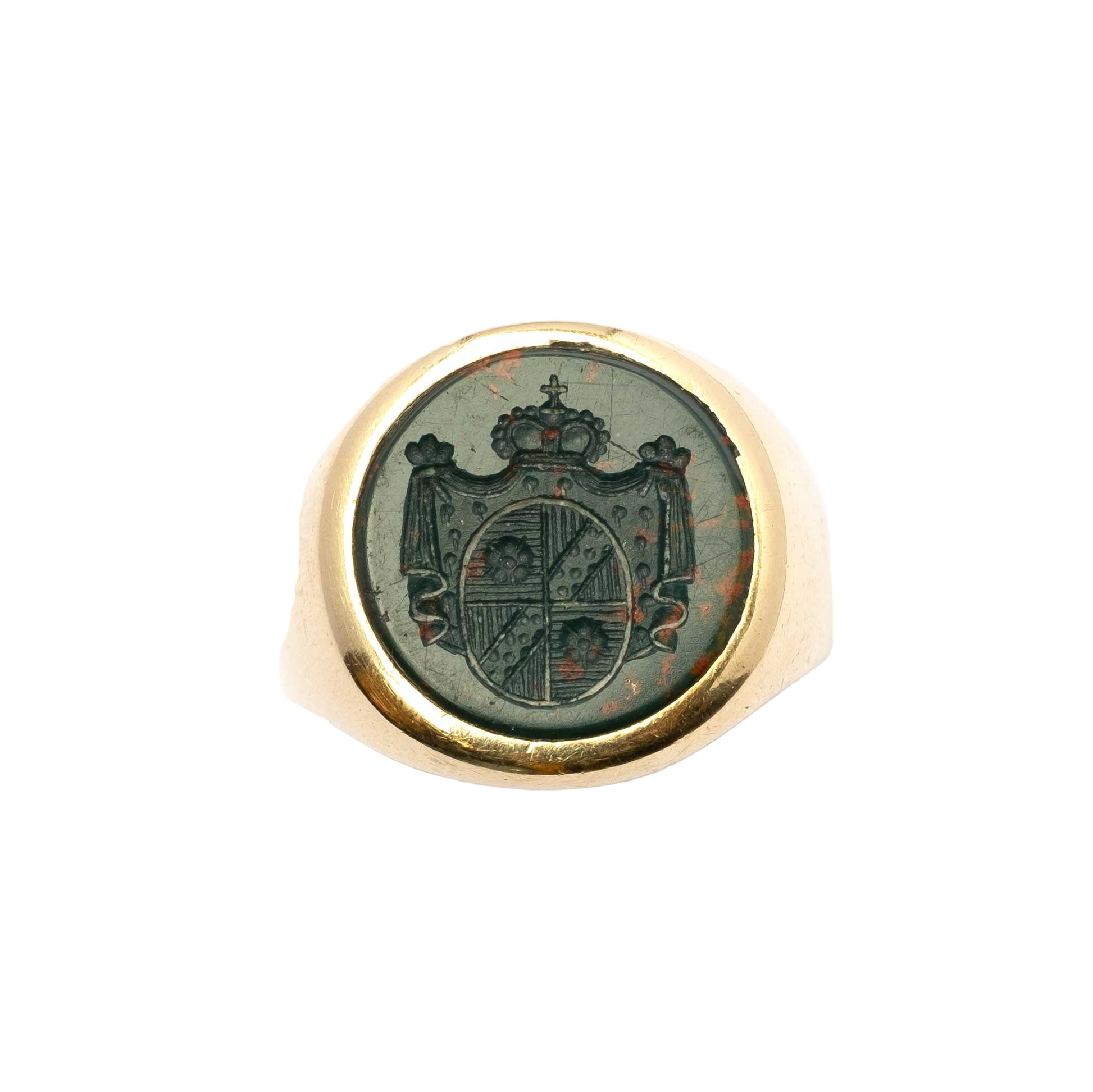 Un affascinante anello sigillo antico, impreziosito da un diaspro sanguigno finemente inciso a mano su pietra dura con uno stemma araldico, montato su oro 9 carati. Un pezzo unico, che unisce storia e maestria artigianale.